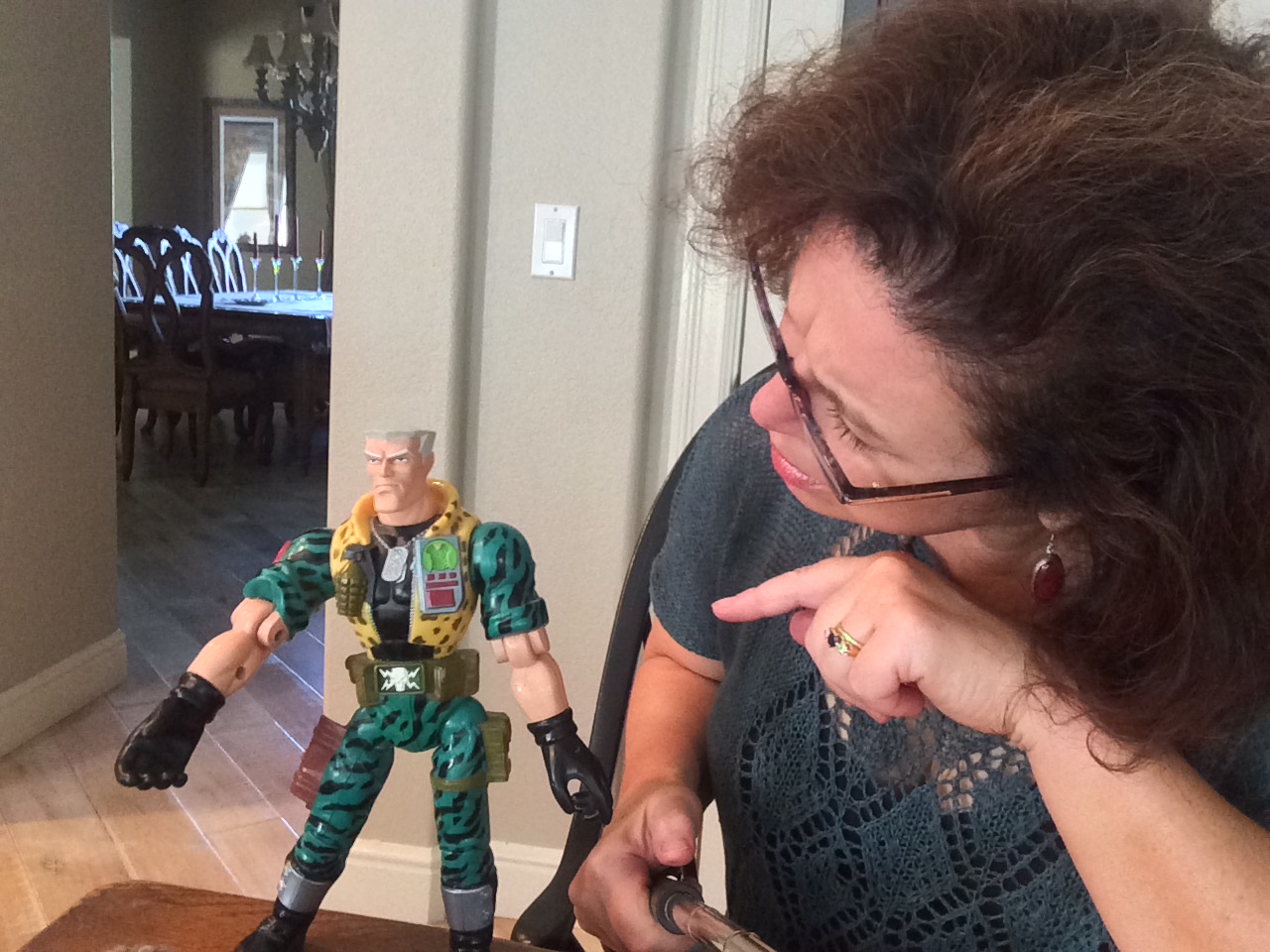 | Marcy wearing her Camaro top, Kim is showing off her hand spun/dyed yarn and her boquet she made for her daughter in-law. |